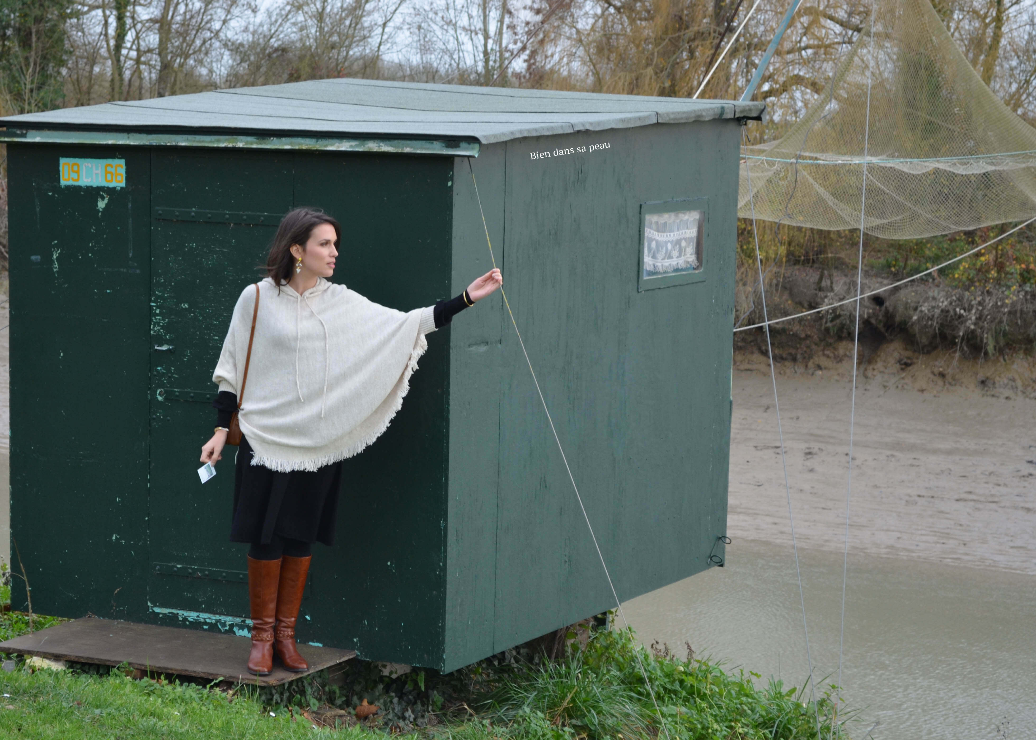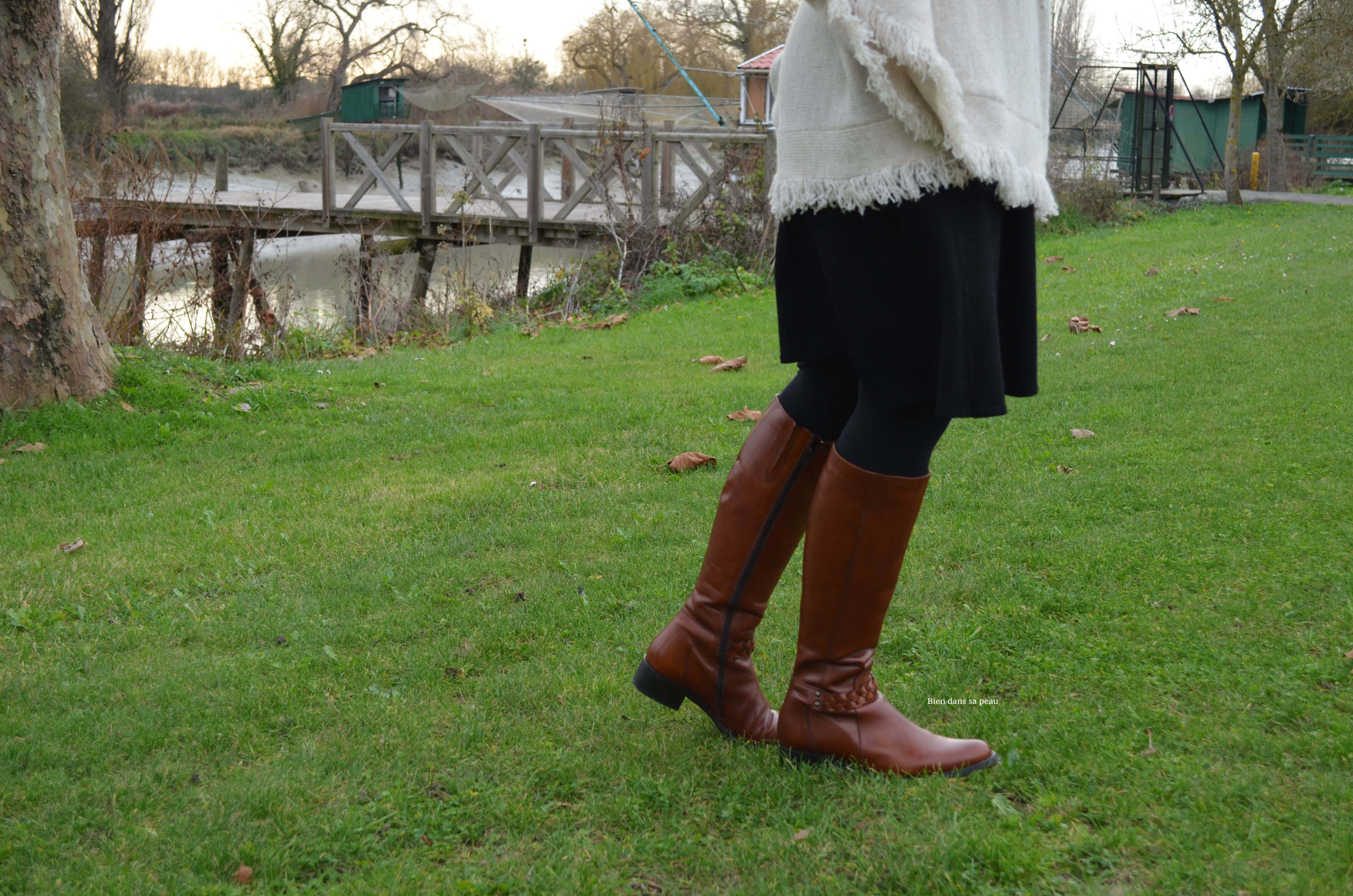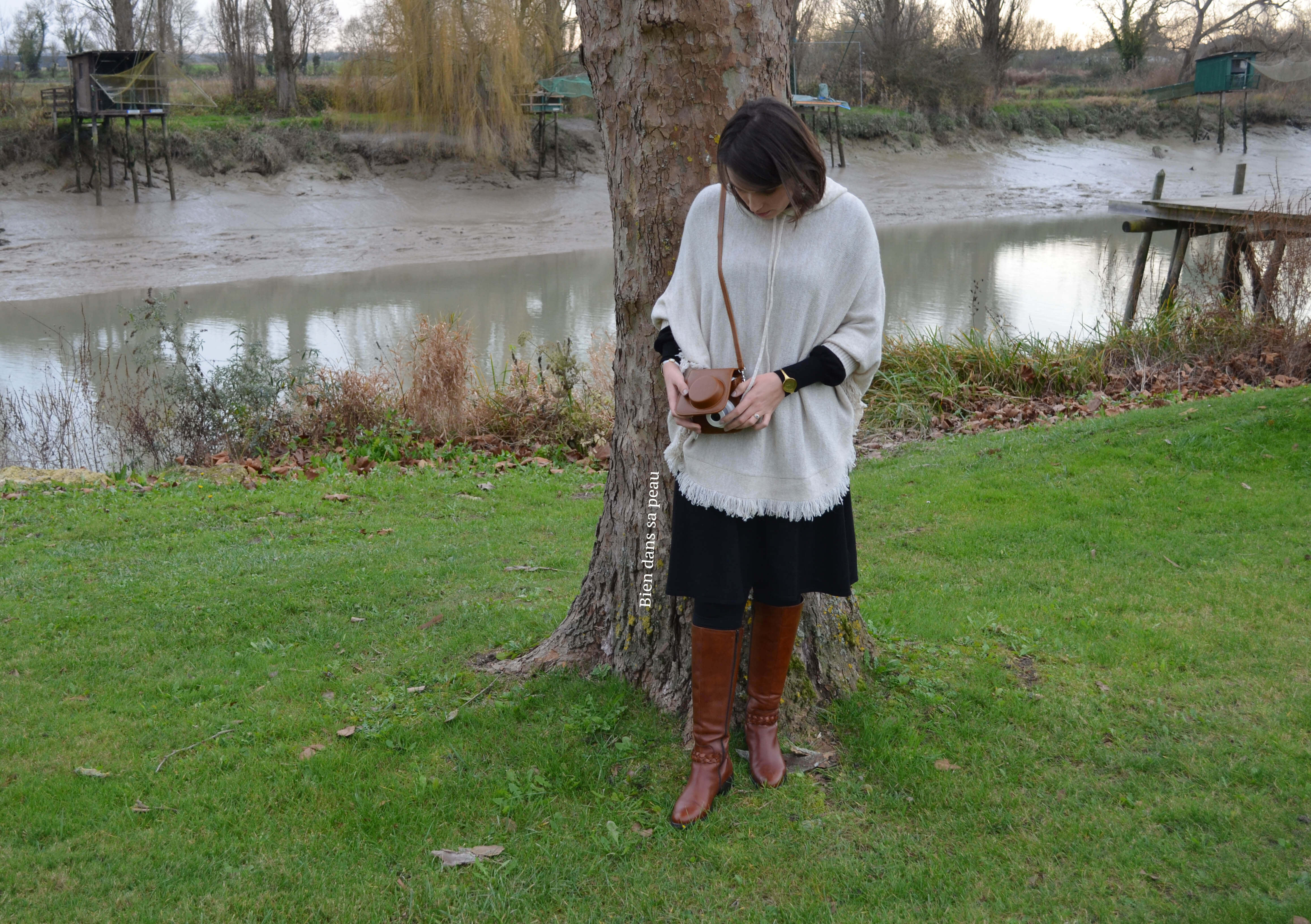 ✰ Il faisait beau depuis des jours et il s’est mis à faire un vent de folie après Noël, j’ai donc eu envie de superposer les couches : un grand poncho beige de Gémo sur une vieille robe noire Zara (quand je dis vieille, c’est que je l’ai achetée en 2008 je crois). Je ne rentrais jamais chez Gémo sauf pour mon fils jusqu’à ce que je vois un superbe poncho Gémo sur Sana dans un lookbook. Je n’ai pas retrouvé le même mais non, je n’ai pas pleuré, Amie Connectée! J’ai trouvé celui-ci qui m’a plu par ses manches et ses franges.