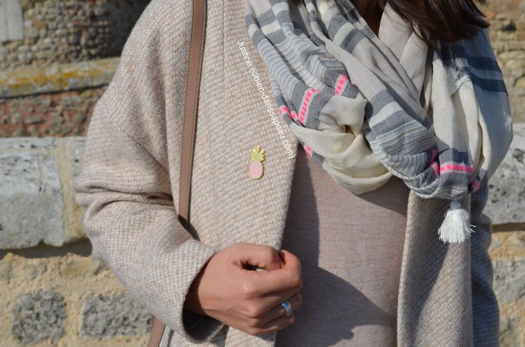 J’ai filé rapidement chez Camaieu acheté ces jolies baskets que tu avais présenté dans ton haul et elles sont très bien assorties avec cette tenue. Mention spéciale pour la petite broche ananas Des Petits Hauts ! J’en ai déjà acheté deux de collections précédentes, je pense que la collection va s’agrandir au fur et à mesure du temps.