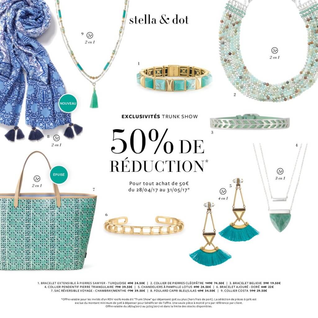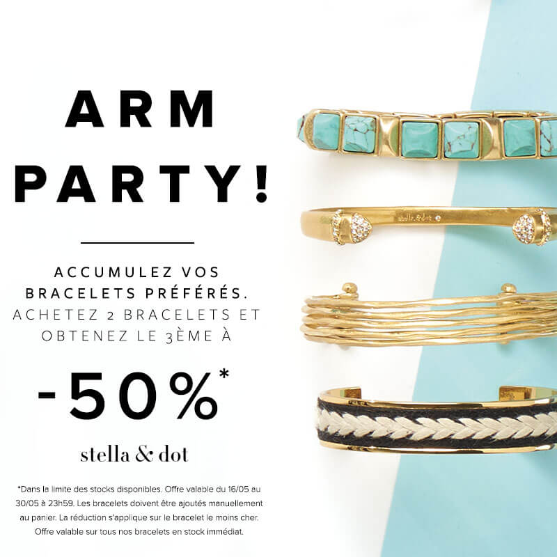 – bijoux (sauf les bagues aux annulaires) de la marque Stella & dot disponibles sur ma boutique en ligne (clique). Sachez que sur ma boutique, et jusqu’au 30 mai 2017, mettez 3 bracelets dans votre panier, le 3ème le moins cher des trois passera automatiquement à -50% sans code promotionnel nécessaire.