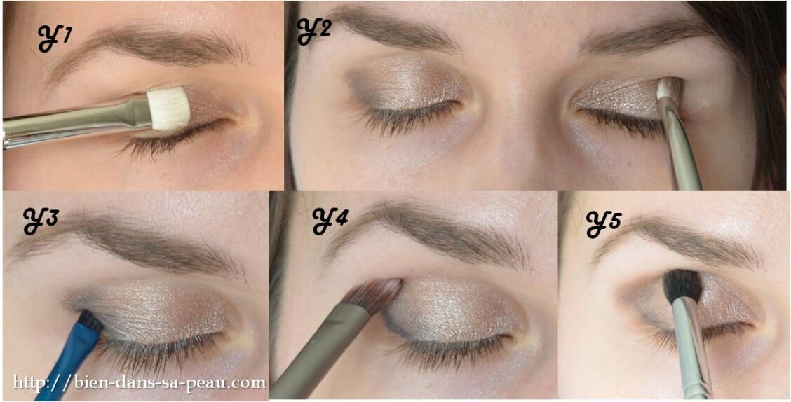 Ensuite, avec un pinceau biseauté, j’applique en V du fard noir (Y3), le fard Creep. J’estompe ensuite le tout (Y4) avec un pinceau touffu… Pour parfaire l’estompage et marquer mon creux de l’œil, j’applique du fard Buck (Y5), légèrement dans le creux de la paupière…