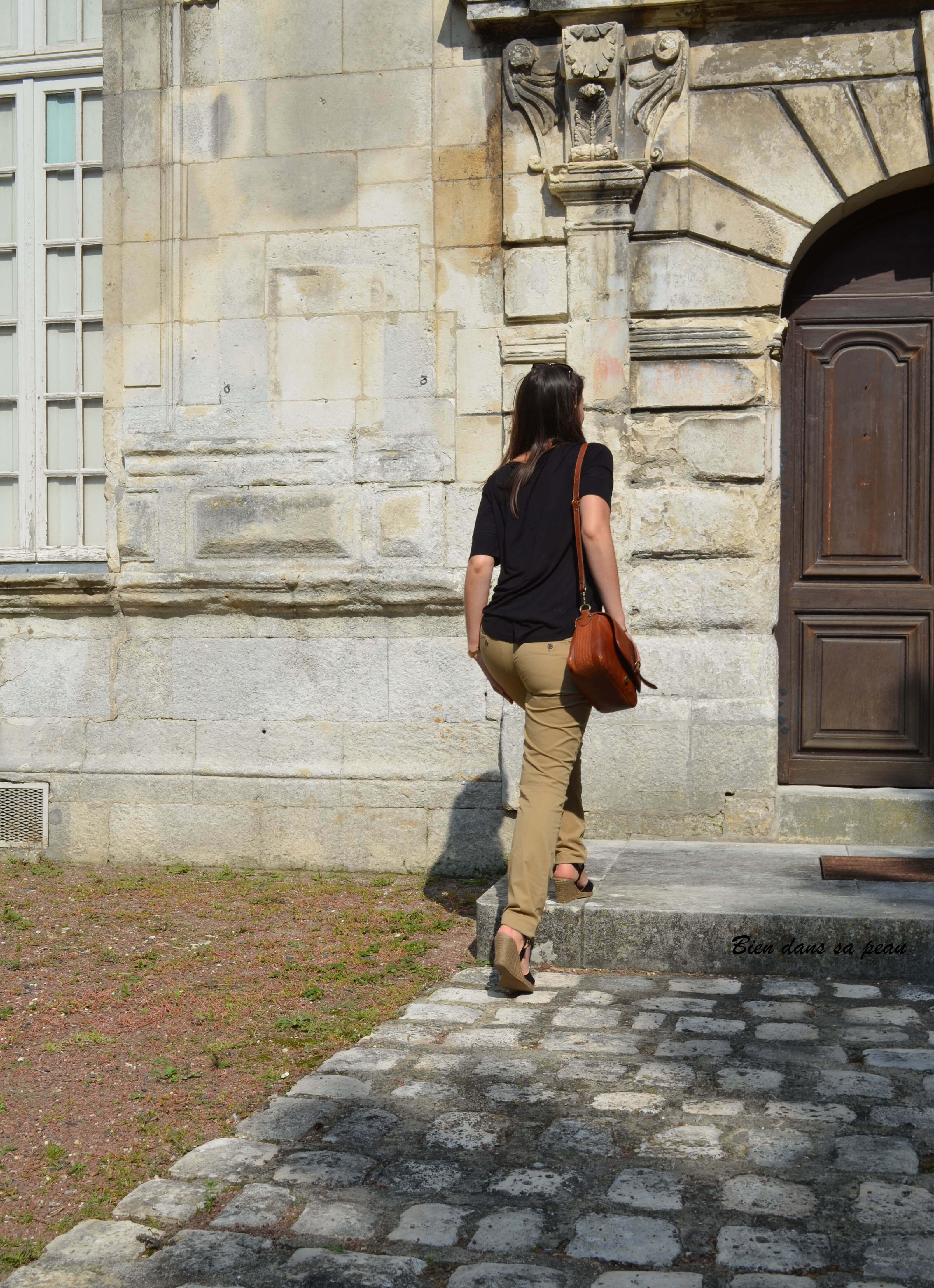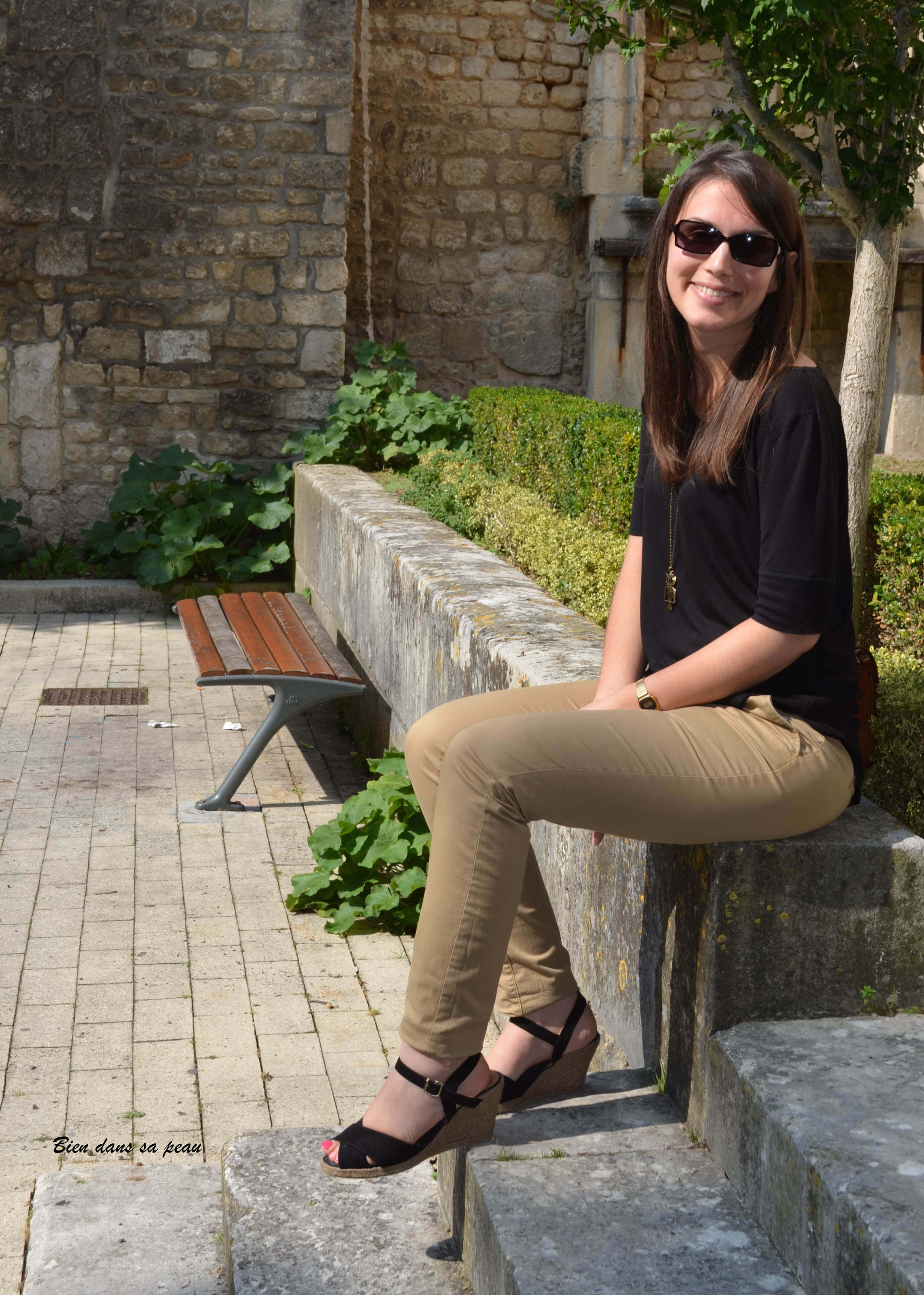 Si vous voulez casser le côté grossissant du pantalon beige, jouez sur les volumes. Pour ma part, j’ai pris un t-shirt noir assez fluide et pas trop court. Celui-ci aussi vient de chez H&M : j’aime la coupe des manches et son petit prix (moins de 15 ou 10 euros).