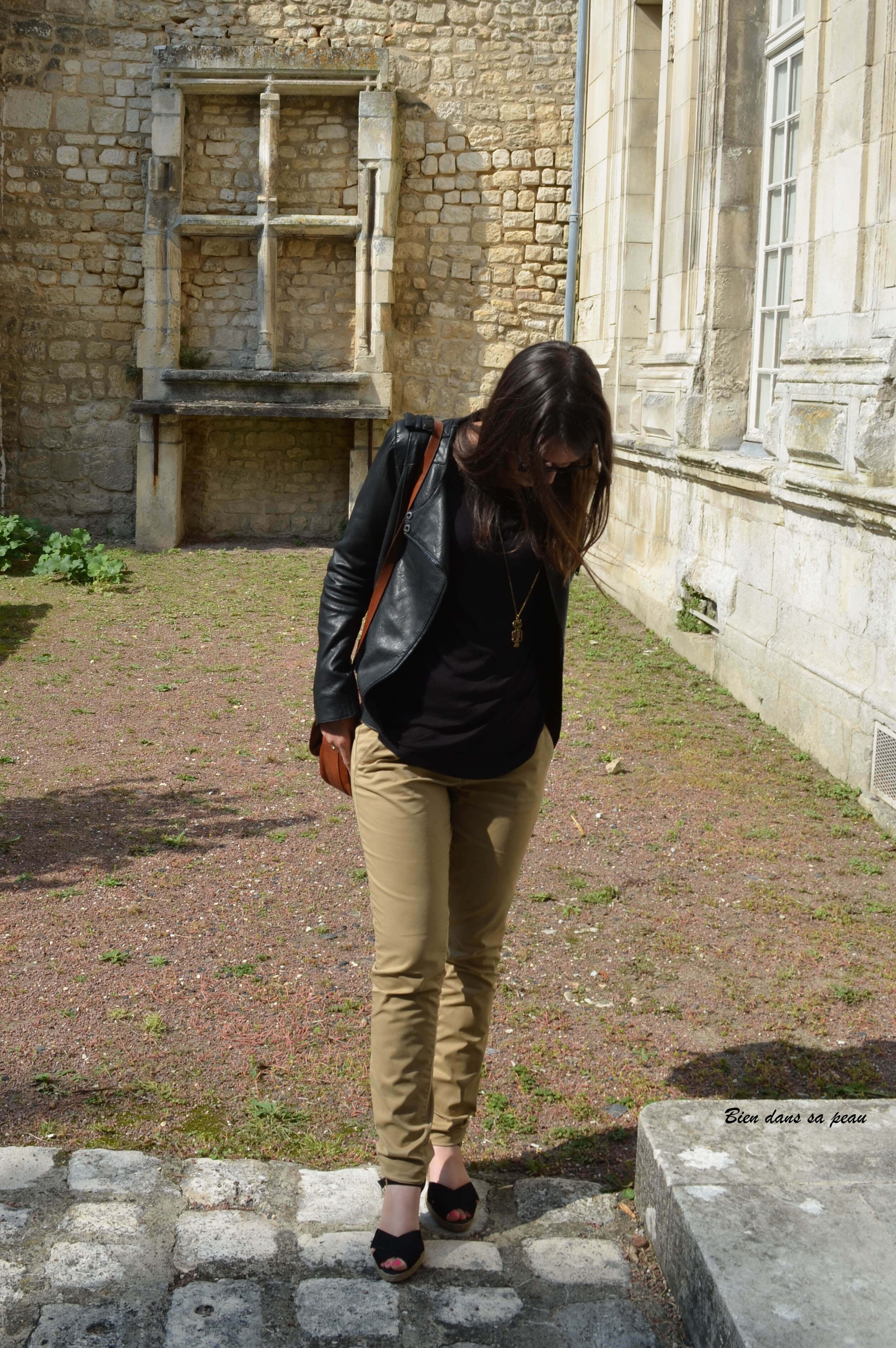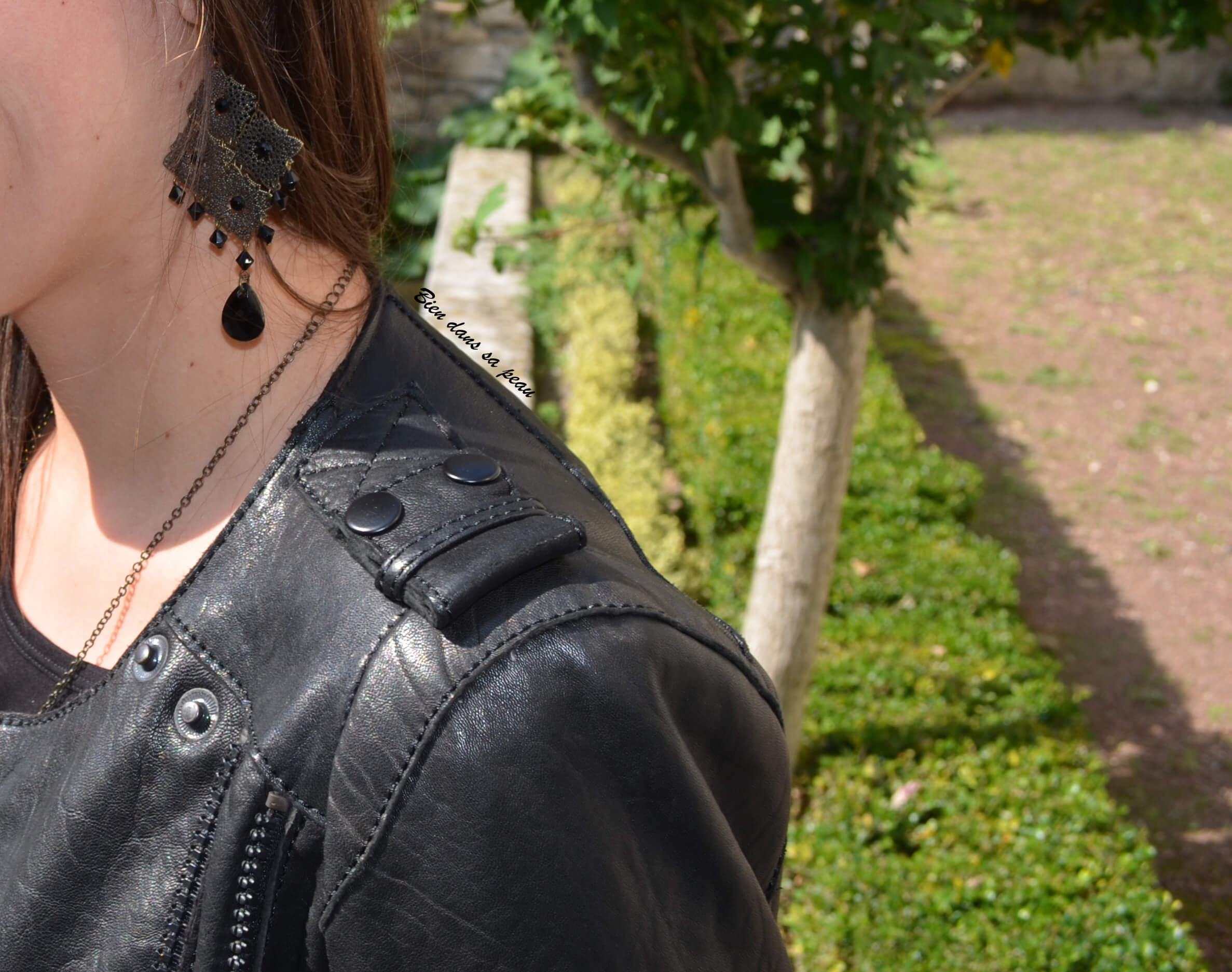 Pour casser le côté chic mais pour garder la classe, rien de mieux qu’un blouson en cuir ! Je trouve qu’on pourrait s’habiller en sac poubelle, tant qu’un joli cuir est là pour rehausser l’affaire ! ;) En fait, je pars du principe pour ma garde-robe de m’habiller peu cher en pantalons et t-shirts mais de toujours conserver des pièces de qualité. Et quand il s’agit de cuir, mon cœur ne peut se résoudre à acheter du faux. Que voulez-vous, le cuir a ses raisons que la raison ignore ;). Avec les bijoux dorés et bronze, le cuir donne un côté rock à la tenue. Et la montre un côté vintage