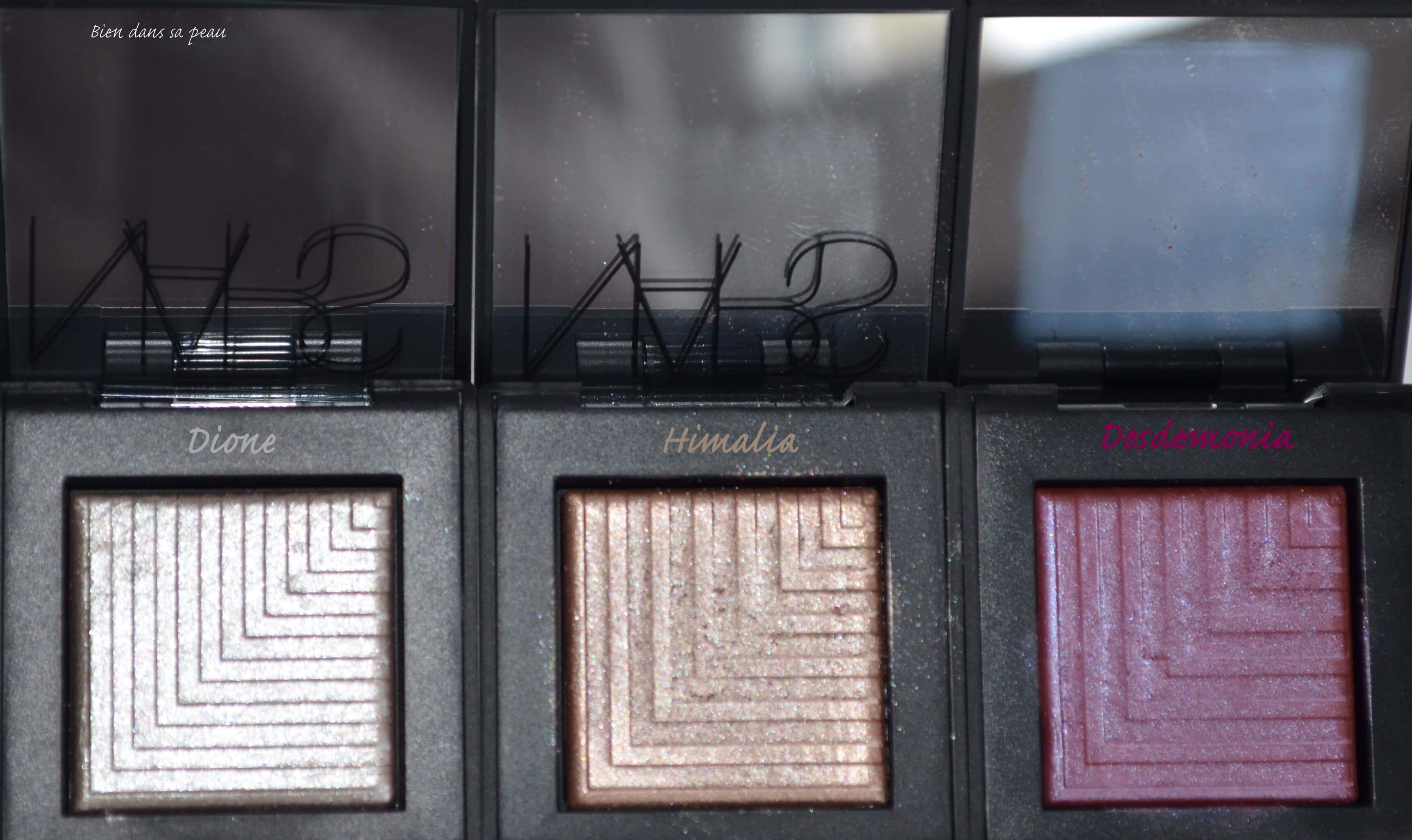 À cette période, avec le temps va, tout s’en va dans mes paniers virtuels ! Surtout que question beauté, 2 mois avant les fêtes, la Fée Marketing nous martèle les esprits avec pas mal de nouveautés auxquelles il est difficile de résister. Vu qu’on est rarement déçue par notre ami François (non, pas Hollande of course! Je parle de Monsieur Nars), et bien je me suis laissée tenter par les nouveaux fards NARS : les Dual Intensity eyeshadows (en Frenchy, ça donne aussi les ombres à paupières à intensités multiples). Je ne savais pas trop ce qu’ils allaient donner mais j’en ai pris quand même trois d’un coup ! Ça s’appelle tenter le diable, vous croyez? Bof, quand il s’agit de produits NARS, le diable doit être occupé ailleurs car on est peu souvent déçue. J’ai acheté la teinte Dione (un champagne gris très lumineux qui ravira n’importe quelle couleur d’iris), la teinte Himalia (un doré froid parfait pour les fêtes, un peu topaze, hyper pigmenté, de loin ma teinte préférée des trois) et la teinte Desdemonia (un prune bordeaux avec lequel on peut s’amuser).