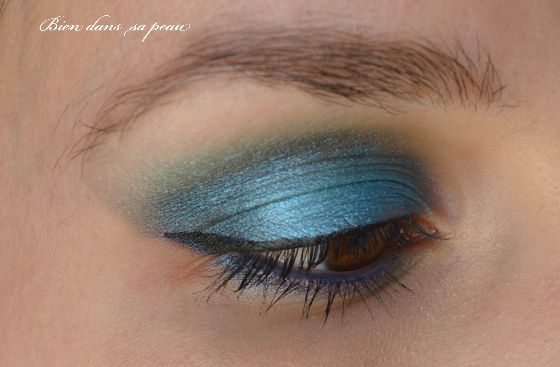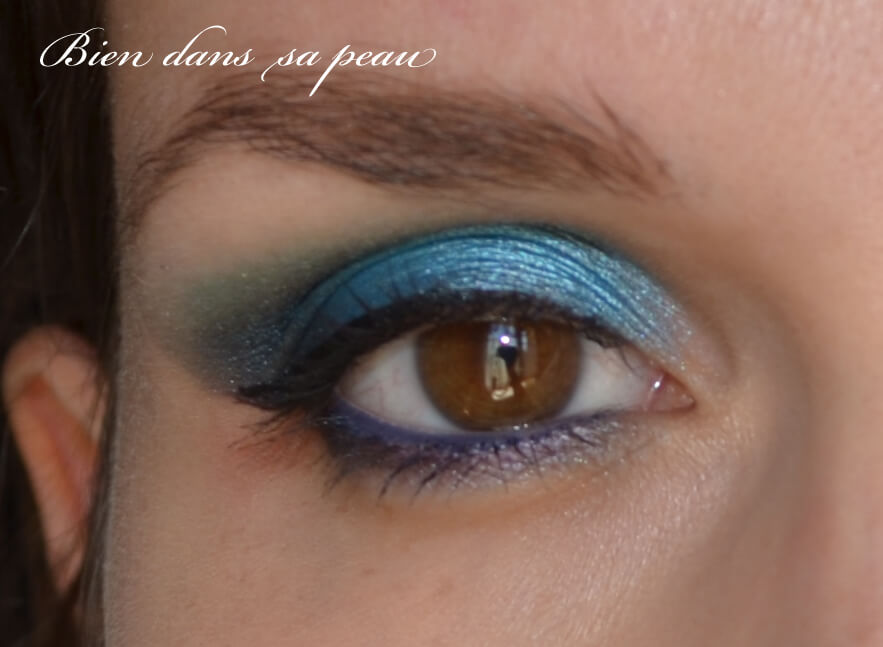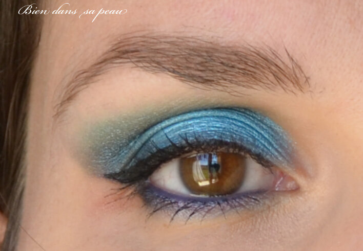 J’ai décidé de vous faire deux maquillages plutôt colorés (on dirait des maquillages de sirène, nan?) mais vous pouvez choisir d’utiliser la deuxième rangée de fards un peu plus neutres pour réaliser un maquillage plus discret. Je trouve que cette palette est parfaite à avoir si vous aimez faire des maquillages colorés pour vos soirées d’été ou pendant les fêtes. Si on laisse parler son imagination, il y a plein de jolies choses à faire avec. On n’est pas forcée de mixer plusieurs fards comme j’ai fait. Par exemple, en appliquant uniquement l’indigo sur la paupière mobile et en ras de cils inférieurs (ne pas oublier d’estomper les contours) et en rajoutant un trait de liner noir avec le fard poudre noir, vous avez un super maquillage de soirée!