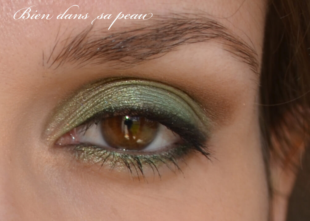 – Sur la paupière mobile mais seulement à mi-hauteur de celle-ci, j’ai appliqué le fard vert sapin.