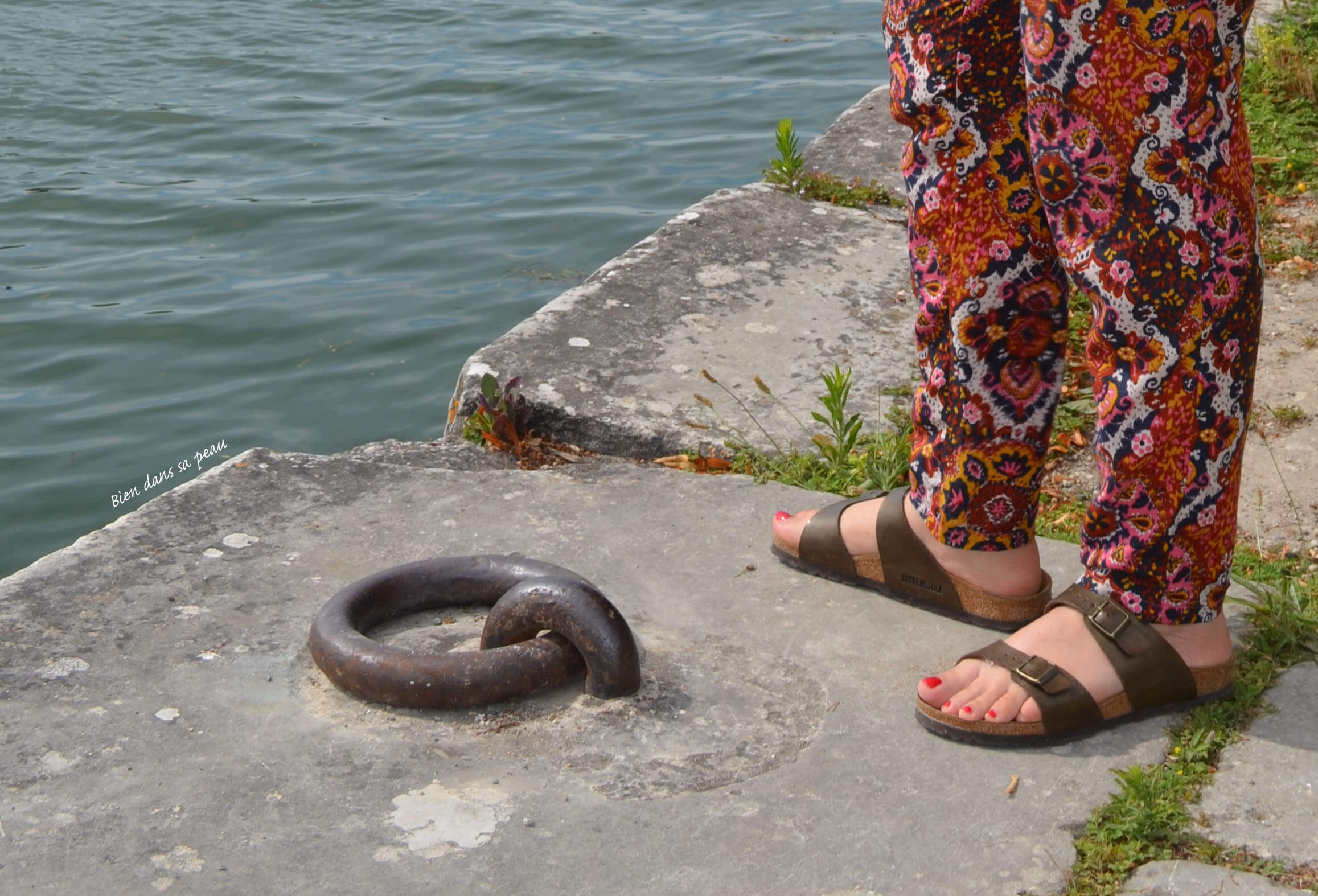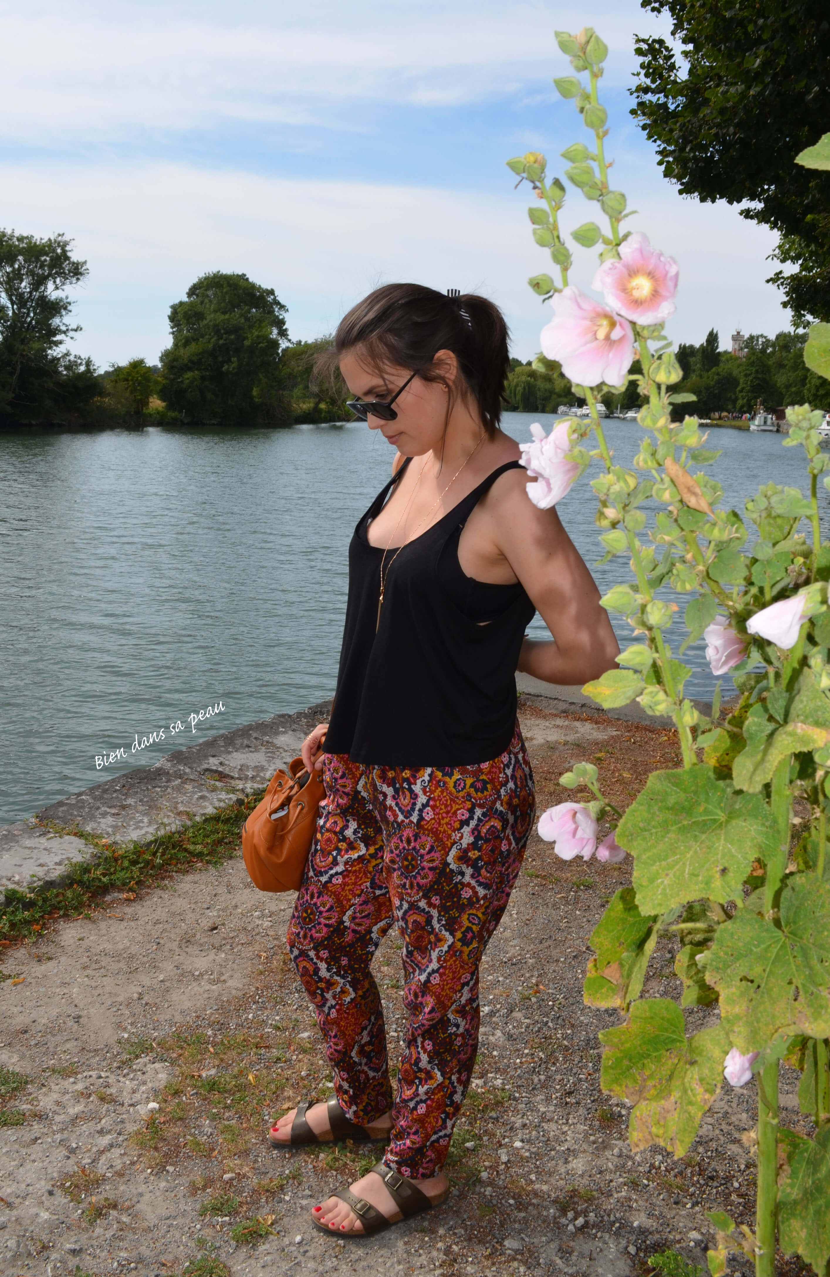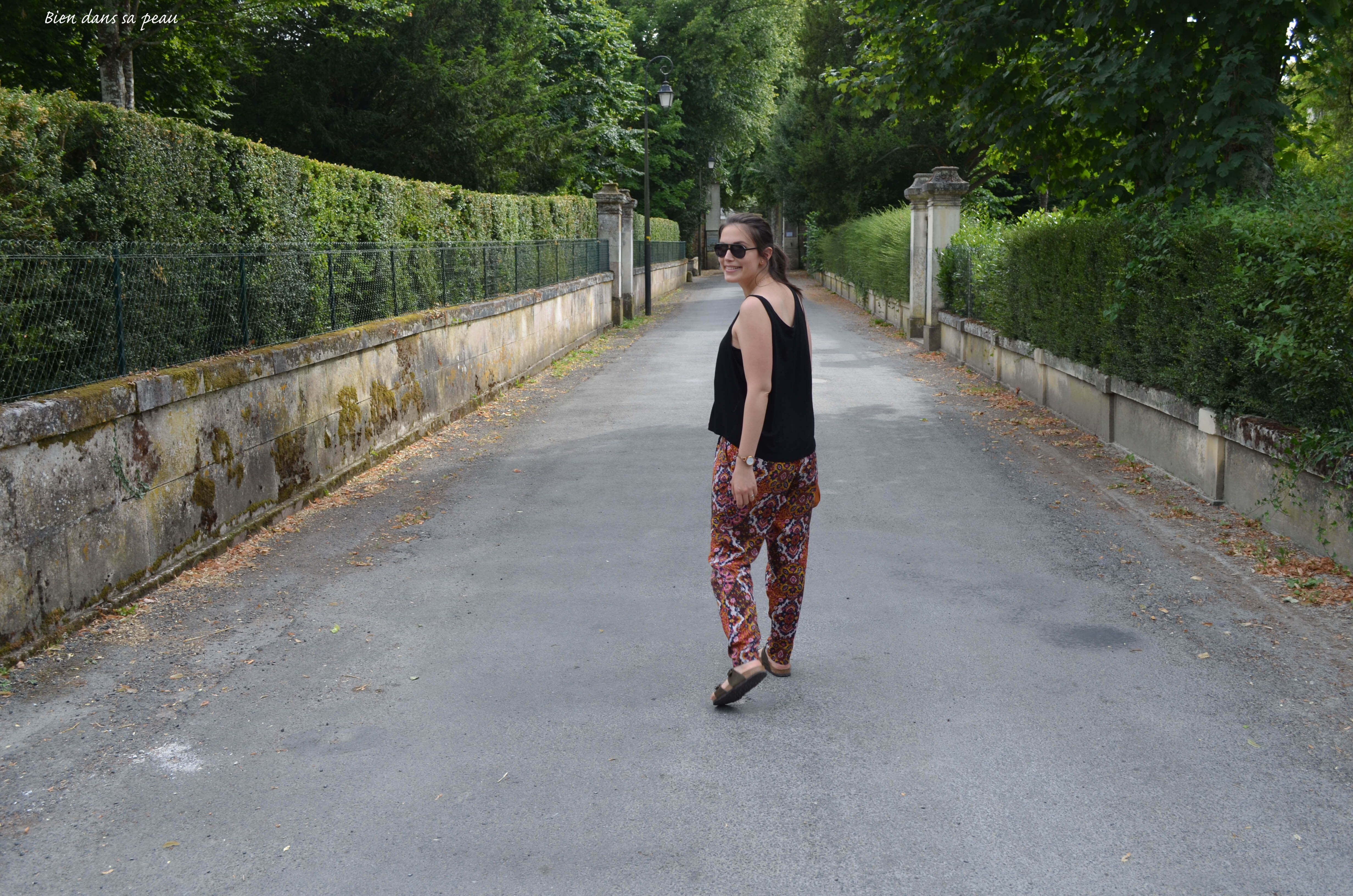 Pour tout de même survivre par ce climat aride, j’ai investi dans des pantalons fluides aux tissus imprimés chez H&M lors des soldes. Le truc que, il y a quelques années, si ma mère m’avait montré des photos de moi étant gamine avec ça (il doit y en avoir), j’aurais dit “Non mais comment on était mal sapées à l’époque”. Sauf que ce truc-là peut faire tout à fait habillé avec mes sandales Minelli à talons compensés vues ici, mais aussi très cool si tout à fait assumées avec mes Birk présentées dans ce billet-là. De plus, même avec 6 à 10 kg de trop, je fais la même taille (38) car c’est extensible.