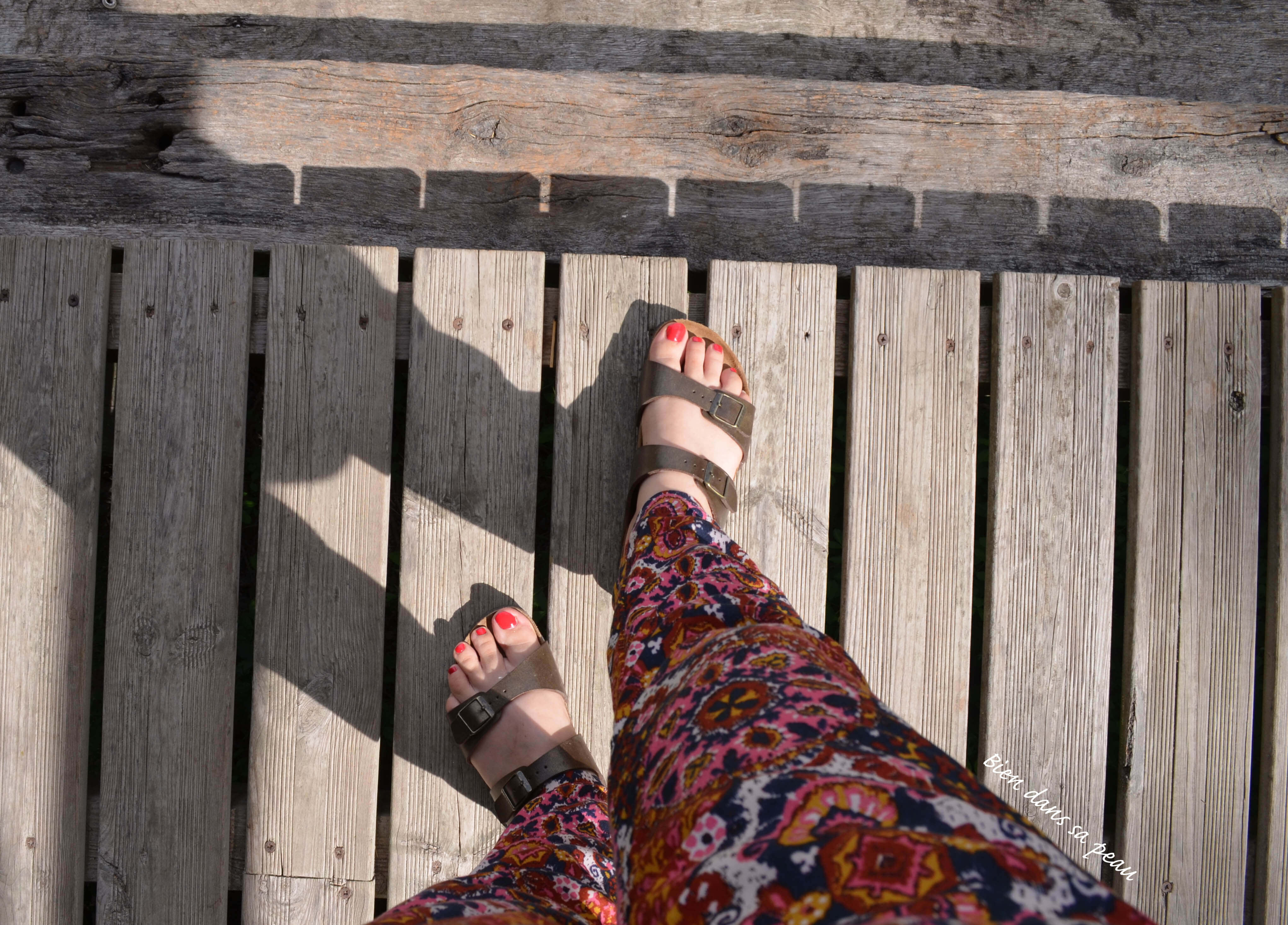 Pantalon en jersey à motifs H&M – Top débardeur court H&M – Birkenstock Sydney vues dans cet article – Sac Sabrina (déjà vu là) – vernis YSL Rouge Pablo