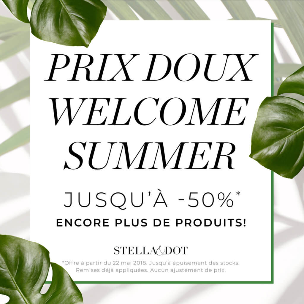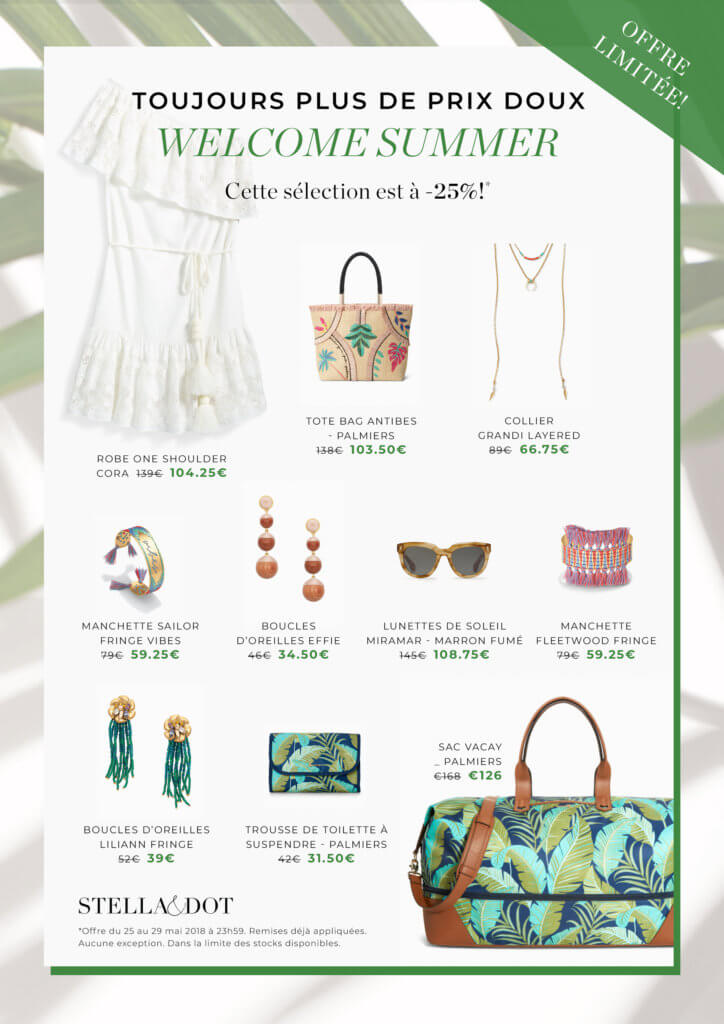 Les bijoux que je porte sont disponibles sur ma boutique STELLA & DOT et sachez que plein de produits sont passés en prix doux jusque épuisement des stocks avec des réductions allant jusque -50%. Quelques produits de la collection été 2018 (voir image suivante) sont passés à -25% jusqu’au 29/05 minuit, profitez-en !