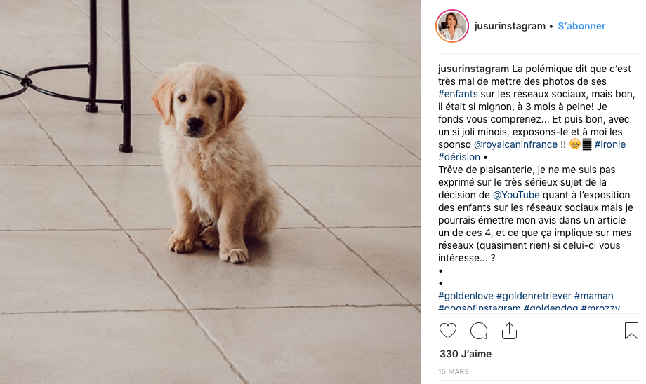 Sur Instagram, je suis un peu plus laxiste : on aperçoit de façon anecdotique la moitié du visage de l’un et de l’autre mais pas plus, bien que je sois persuadée que mes enfants sont magnifiques. C’est parfois irrésistible de publier une photo craquante! Par ailleurs, en aucun cas leur joli minois n’a fait l’objet de sponsoring. Ils ne sont pas non plus forcés à une quelconque mise en scène pour obtenir la photo : je tiens au naturel des clichés, et à la liberté de mes enfants.
