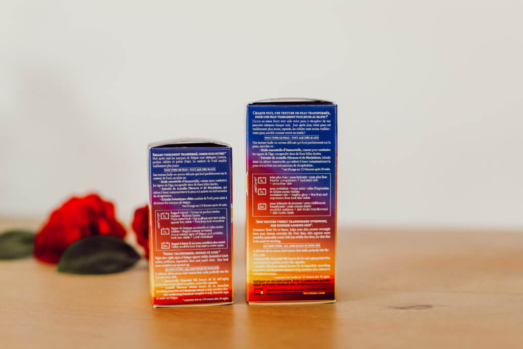 Dans chacun des deux soins, on retrouve un des actifs iconiques chez L’Occitane : l’huile essentielle d’immortelle bio de Corse, connue pour combattre les signes de l’âge. Ce précieux ingrédient est encapsulé dans les fines billes dorées qu’on voit dans le produit.