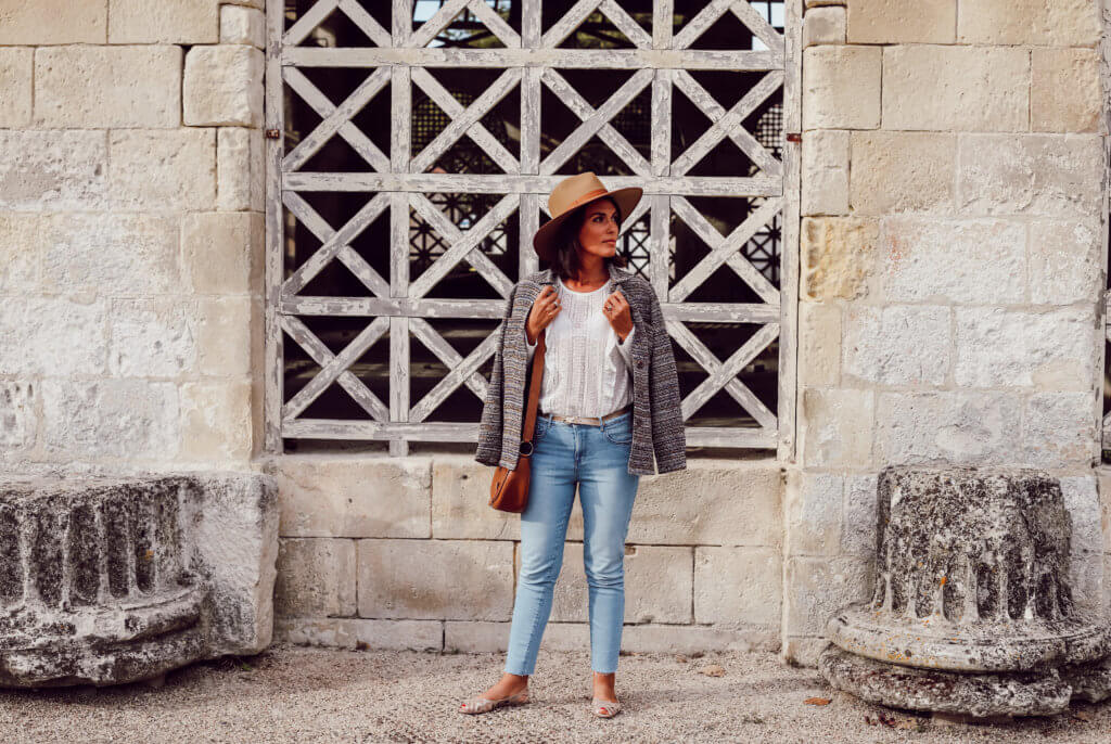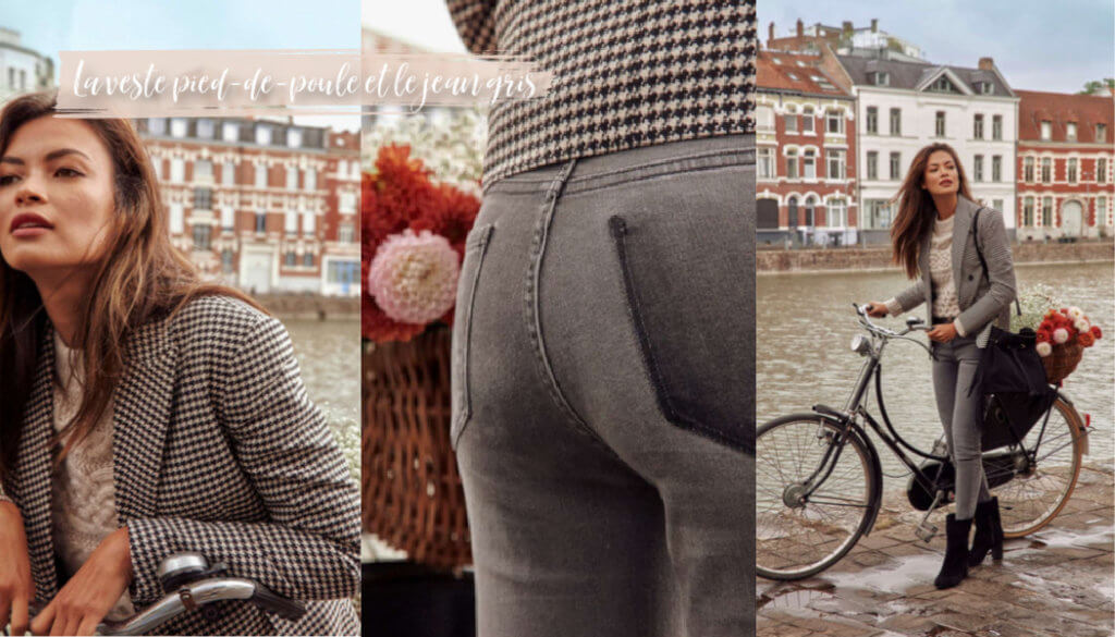 Cette veste n’était pas en stock lorsque j’ai passé ma commande et c’est bien dommage. Elle est maintenant sur ma liste de convoitises mode. Sa coupe blazer est parfaite et d’aussi loin que je m’en souvienne, j’ai toujours vu du pied-de-poule dans la garde-robe des femmes que j’ai connues… Voyez comme c’est un incontournable ! Avec ce type de pièce forte, le jean Gaspard qui élance la silhouette est parfait.