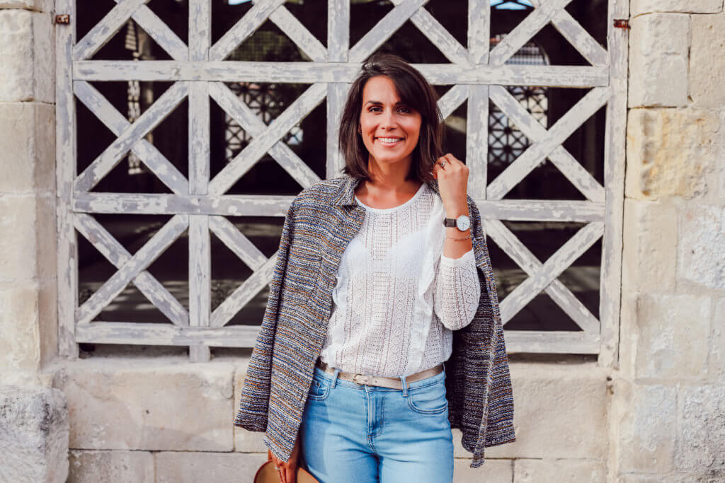 J’ai tout de suite adhéré à la forme sur-chemise de cette veste ainsi qu’à son motif tweed tissé que je trouve bien travaillé. Les détails de bleu permettent de l’associer facilement avec un denim clair comme celui que je porte ou encore avec un pantalon blanc. Parlons d’Emile ! Oui, le pantalon ! Vous aurez remarqué que chez Promod, chaque jean porte un prénom masculin. Et bien Emile m’enveloppe remarquablement bien les fesses. Bon, dit comme ça si on sort du contexte, c’est un peu douteux mais vous aurez compris que je parle du pantalon. C’est l’un des jeans les plus confortables que j’ai pu enfiler. Il emboite bien la taille sans descendre au niveau de l’entrejambe et la coupe 7/8ème est parfaite. Avec ses détails effilochés aux chevilles, ça lui donne un côté rock. Comme chaque année sur l’e-shop Promod, j’ai craqué sur une blouse en dentelle blanche. C’est pour moi un basique qui apporte beaucoup de féminité à une tenue.