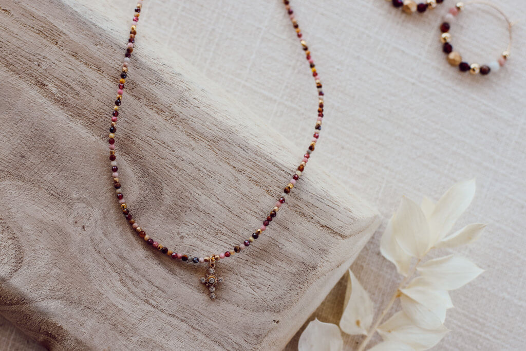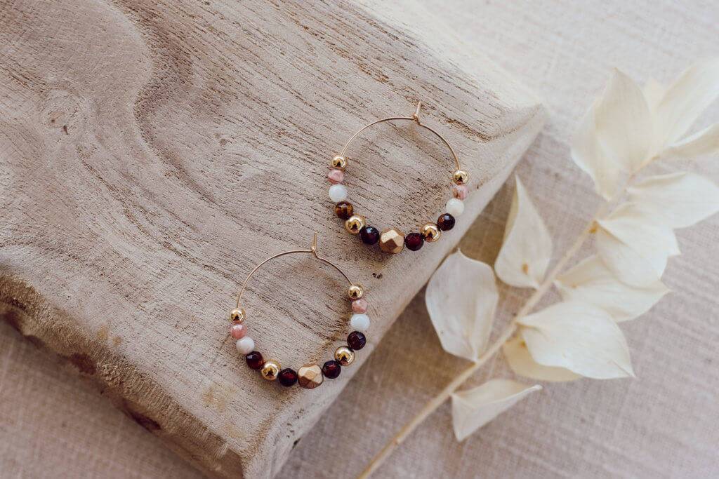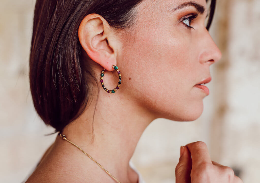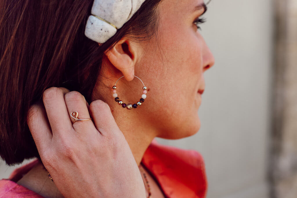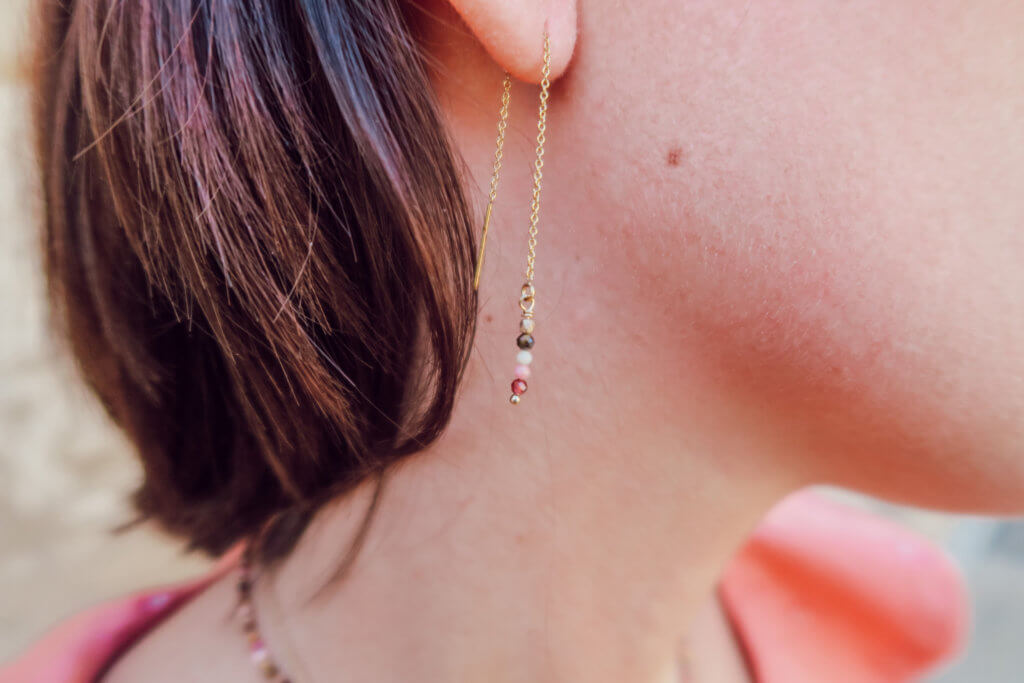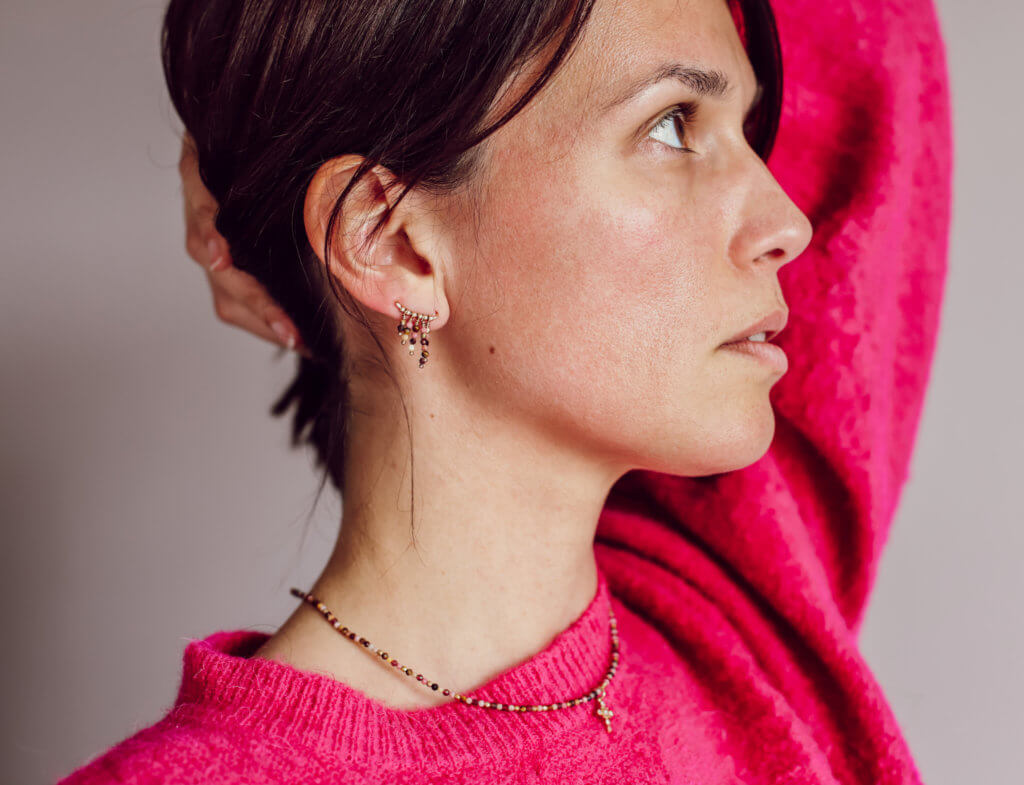 Ces pièces de la gamme Rose Précieuse reprennent un assemblage de perles de verre, d’œil de tigre, de jaspe ou rhodochrosite, de grenat et d’agate sur du goldfilled 14k. Un résultat couleur “blush”, coloris délicats passant avec beaucoup de tenues claires… Pour les boucles d’oreilles grimpantes et chaines, vous retrouvez ce dégradé de couleurs sur les 3 métaux…