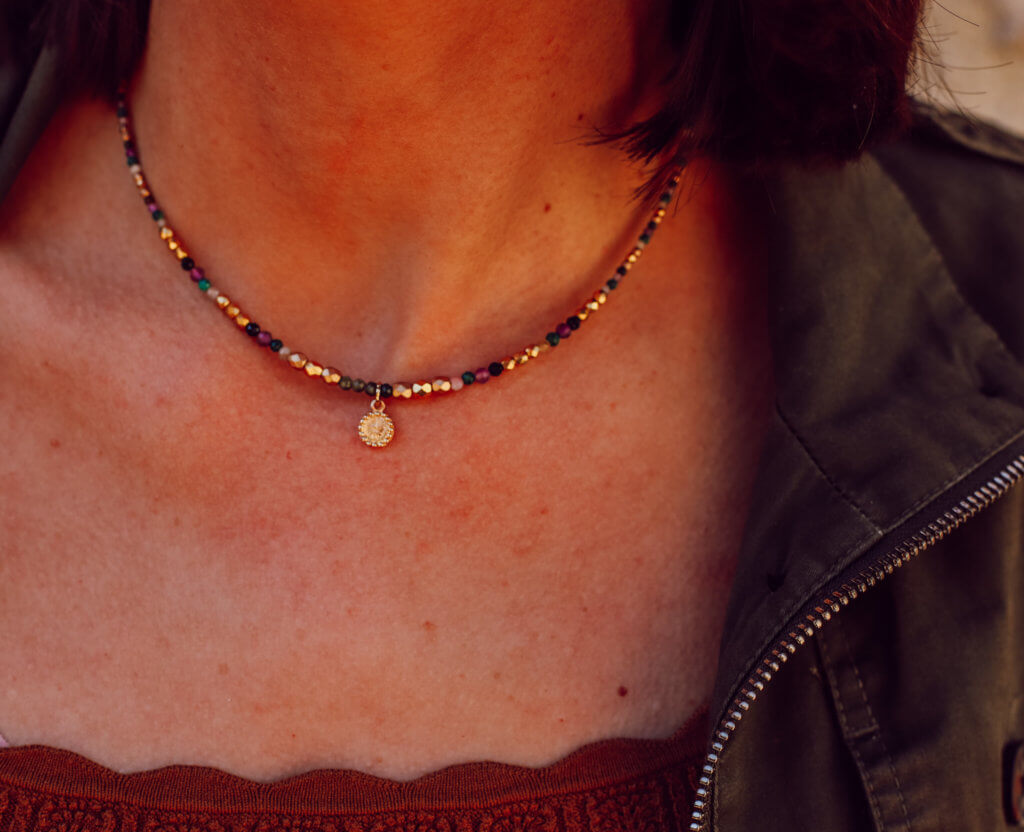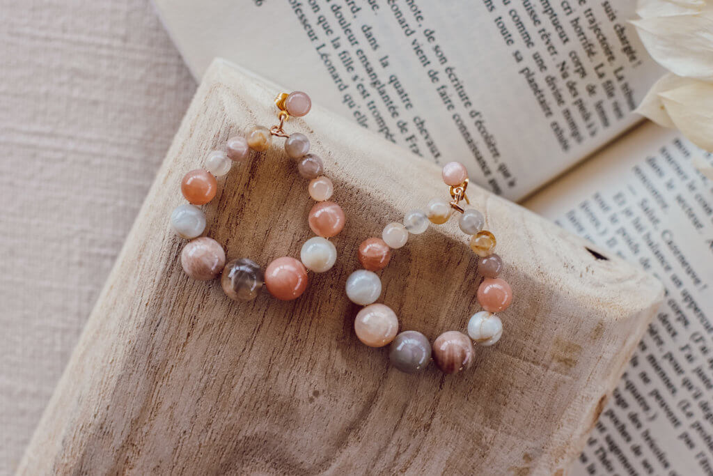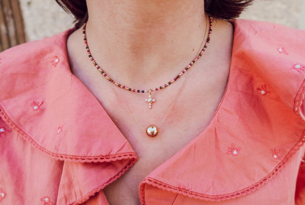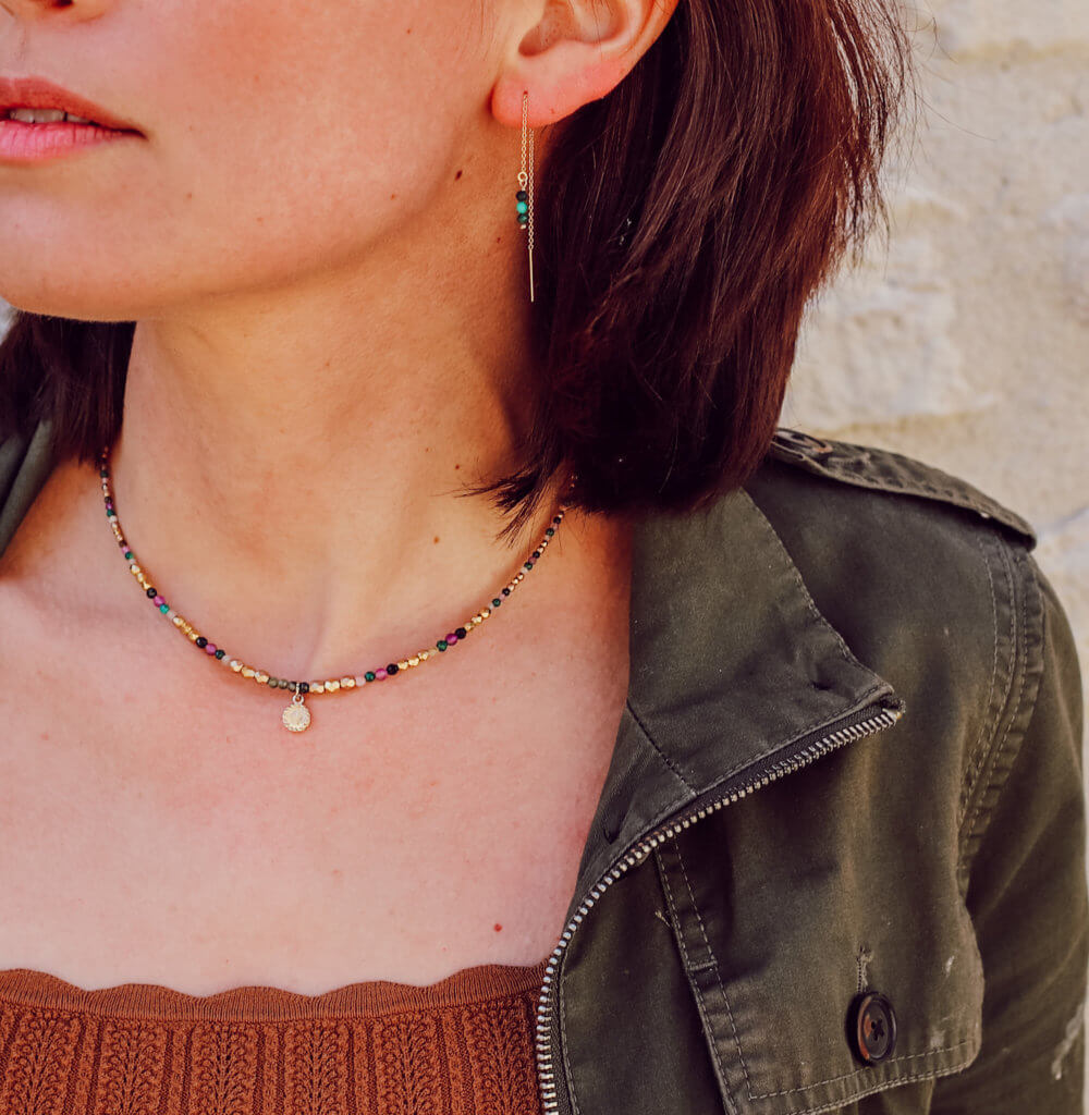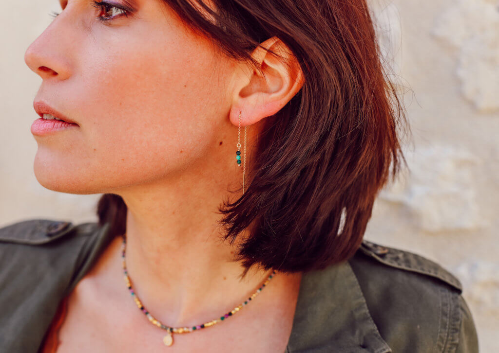 Ces pièces de la gamme Rose Précieuse reprennent un assemblage de perles de verre, d’œil de tigre, de jaspe ou rhodochrosite, de grenat et d’agate sur du goldfilled 14k. Un résultat couleur “blush”, coloris délicats passant avec beaucoup de tenues claires… Pour les boucles d’oreilles grimpantes et chaines, vous retrouvez ce dégradé de couleurs sur les 3 métaux…