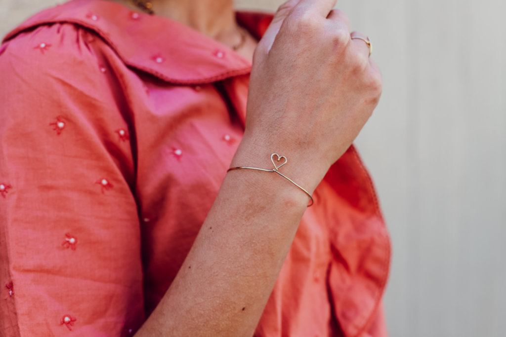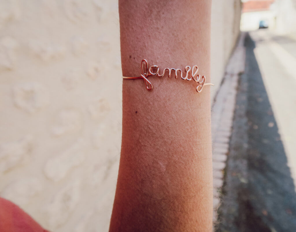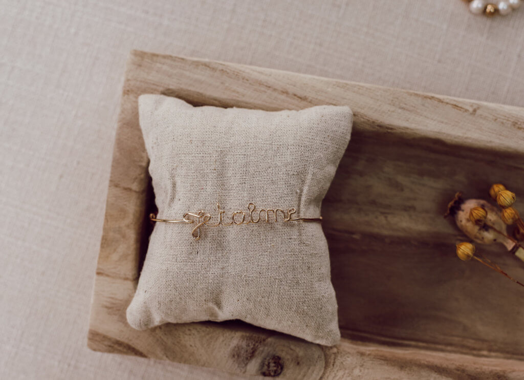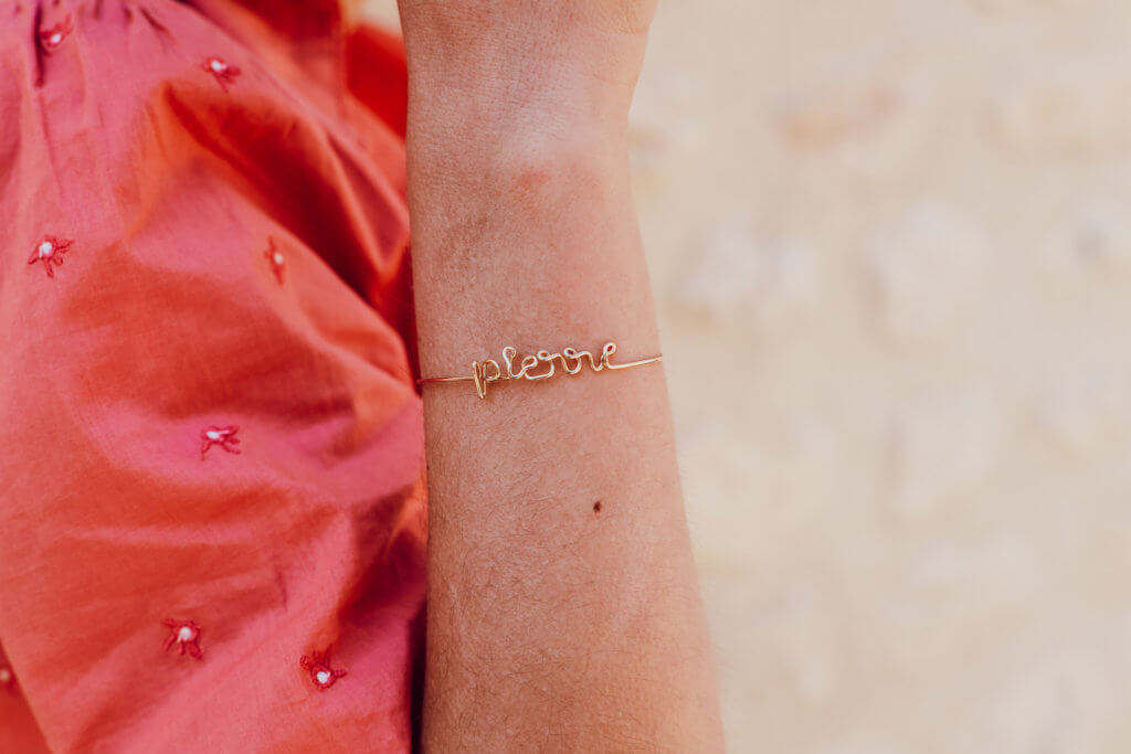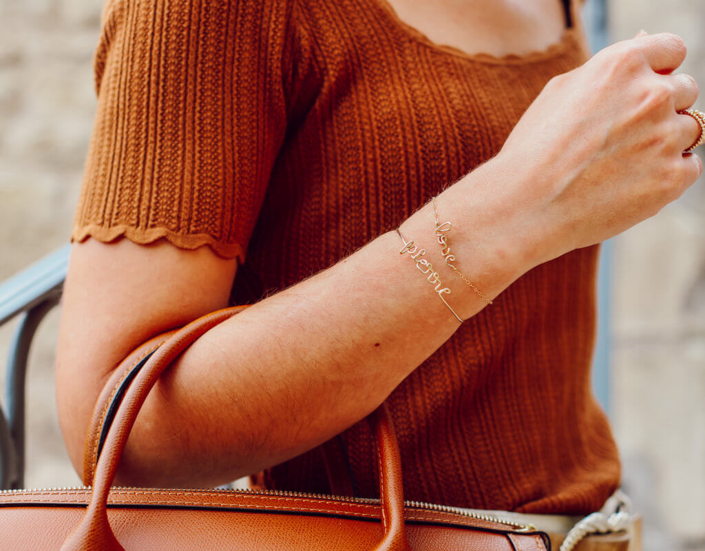 J’ai alors eu très envie d’en apprendre davantage sur le travail de ce fil de métal précieux, notamment parce que les possibilités de créations sont presque illimitées. Aussi, j’aime le concept de pouvoir vous proposer des bijoux personnalisables. Pour ce printemps nait donc la gamme “Au Fil de Vos Mots” : bracelets, boucles d’oreilles, Colliers, vous pouvez raconter votre histoire sur vos bijoux pour porter sur vous vos émotions, des mots doux ou les prénoms qui vous sont chers. Cette technique est le fruit d’un travail artisanal minutieux de torsade et sculpture du fil de métal précieux : goldfilled 14k jaune ou rose et argent 925/1000. Bien sûr, mon cœur balance pour le goldfilled qui est un traitement venant des USA. En combinant pression et chaleur, la fabrication du goldfilled consiste à recouvrir une base laiton d’une solide couche d’or. Le poids d’or dans un bijou gold-filled correspond à 1/20 du poids total du produit soit environ 50 à 100 fois plus que dans un produit plaqué or 3 microns qu’on connait habituellement. De manière générale, le gold filled a une excellente qualité et durabilité, meilleure que celle du plaqué or.