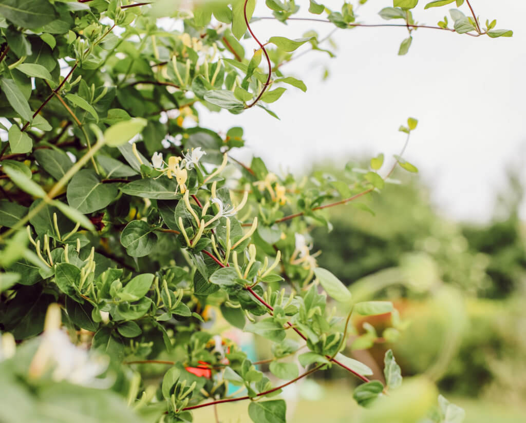 Pour vivre heureux, vivons cachés ! Et se cacher par de la végétation prend du temps, donc en amont de notre installation, il est bien de penser aux haies qu’on va installer dans son jardin en prenant en compte les règles que certaines communes peuvent imposer. Ici, on a globalement planté des haies fleuries dont une partie comprend des lauriers rose (également dans certains massifs) car ils nous font vraiment penser au sud, aux vacances… Leurs fleurs rose ou blanches apportent de belles touches de couleurs au jardin, aux massifs de pierre… Dans les endroits où il était possible de faire grimper des plantes, on a planté une glycine, une clématite, et du chèvrefeuille qui viennent habiller à merveille ces palissades. Le chèvrefeuille est vraiment très agréable pour son odeur.
