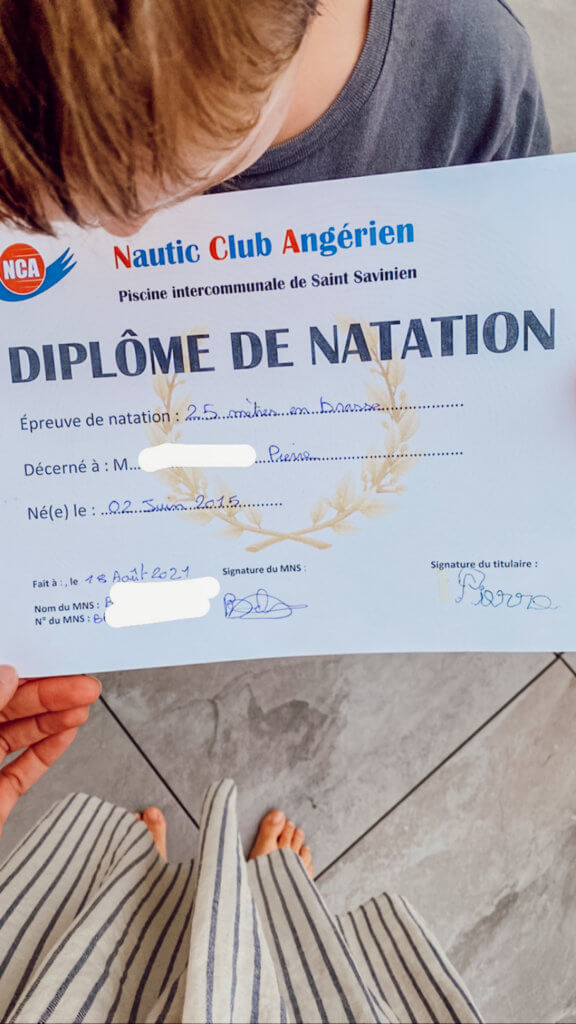 Je ne peux pas dire que, ce dernier mois de juillet 2021, tu étais très motivé à apprendre à nager… Il faut dire que la météo a été très mauvaise cet été-là. Alors que je te disais à 10h le matin “mais si rentre dans l’eau, c’est bon, elle est bonne, fais pas ton frileux!”, secrètement, je n’aurais eu aucune envie de mettre un orteil dans l’eau à ta place sous ce ciel gris ! Enfin, c’était pour la bonne cause car ton Papa et moi tenions que tu apprennes à nager pour deux raisons primordiales : c’est un très bon sport et surtout, pour ta sécurité, il faut savoir s’en sortir dans l’eau ! Et tu l’as fait, à reculons au départ, mais tu as su nager en brasse les 25 m pour le diplôme. Aujourd’hui, avec un peu plus de confiance en toi, tu sais même nager la tête sous l’eau, bravo !