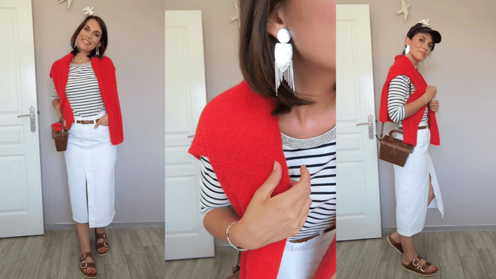 Je vous ai proposé un REEL avec 3 looks composés à partir d’une jupe midi denim blanche shoppée 29,90 euros chez Mango (taille 36 ou S pour moi).