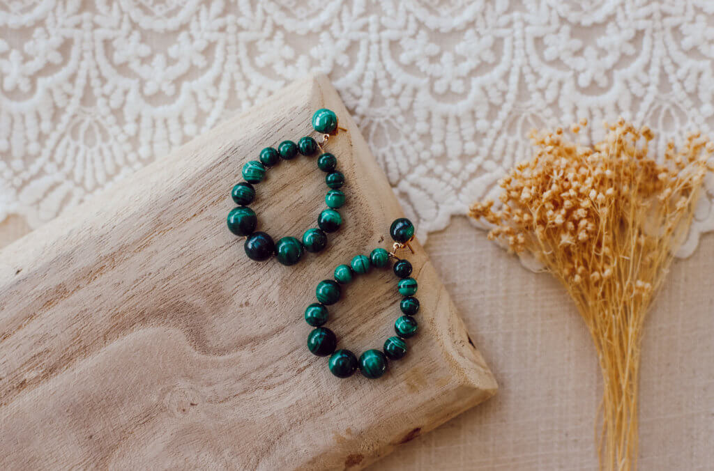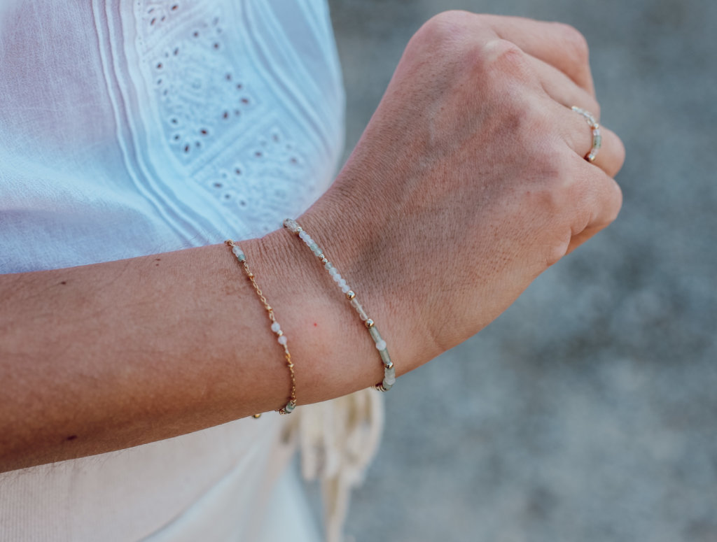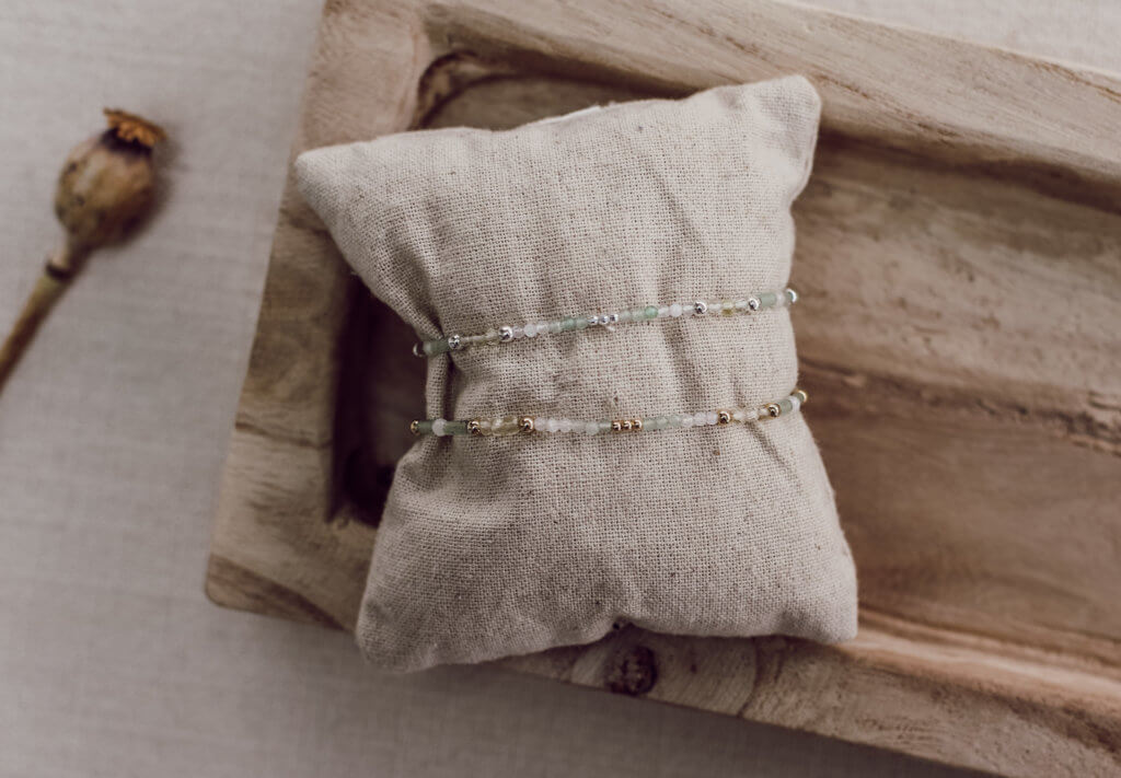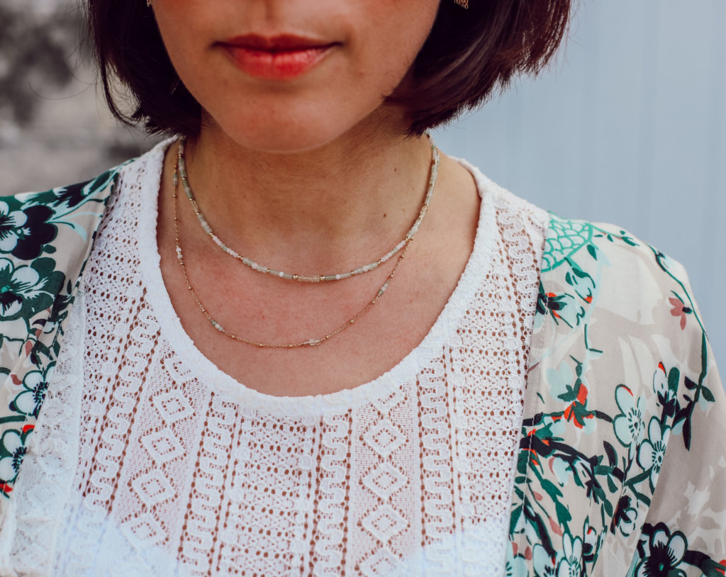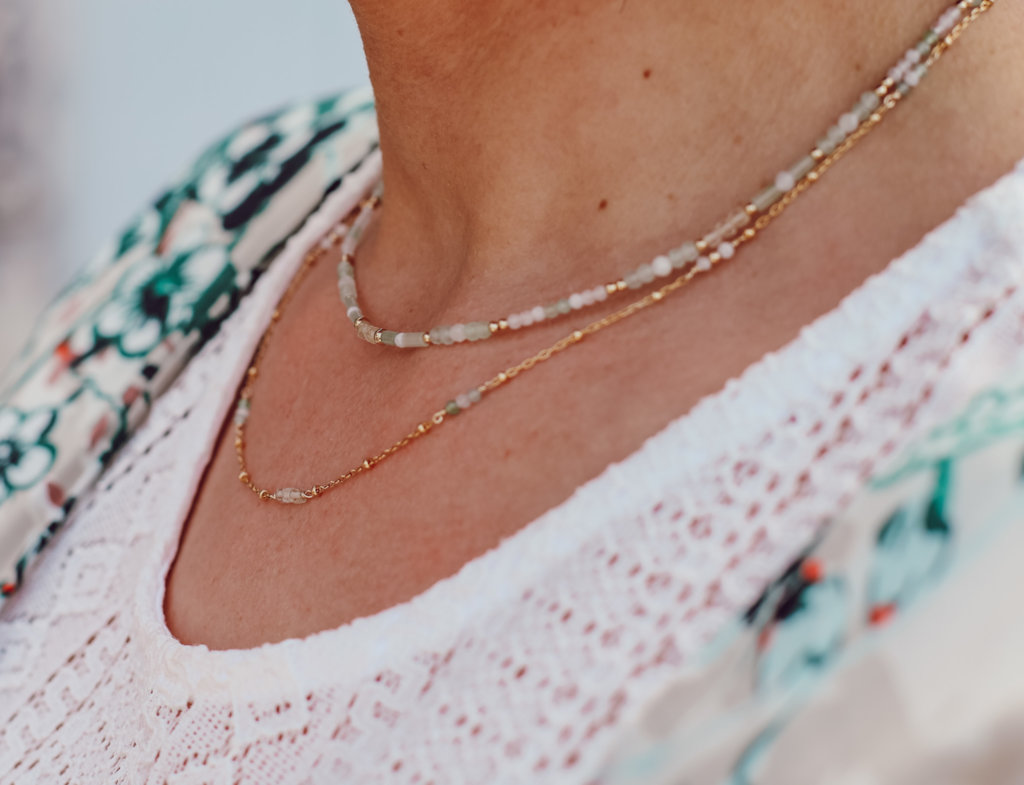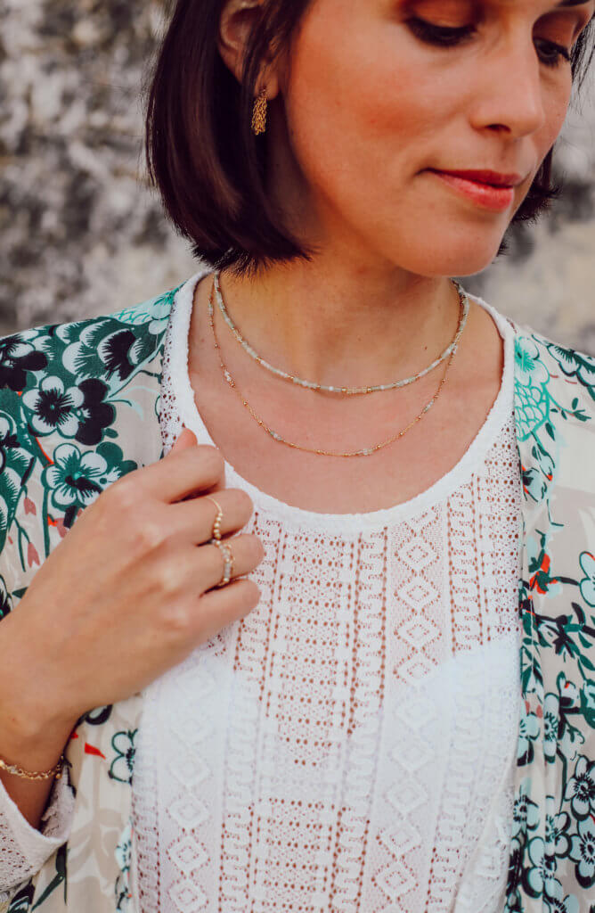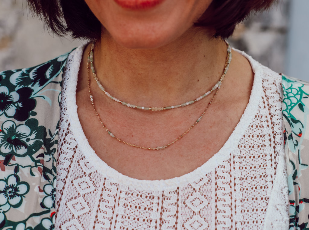 Mention spéciale pour la parure Aventure avec le vert tendre de l’Aventurine qui sublimera n’importe quelle couleur de peau.