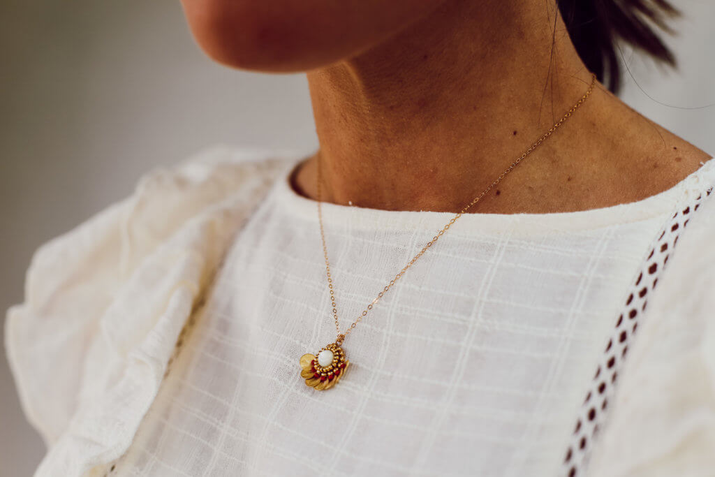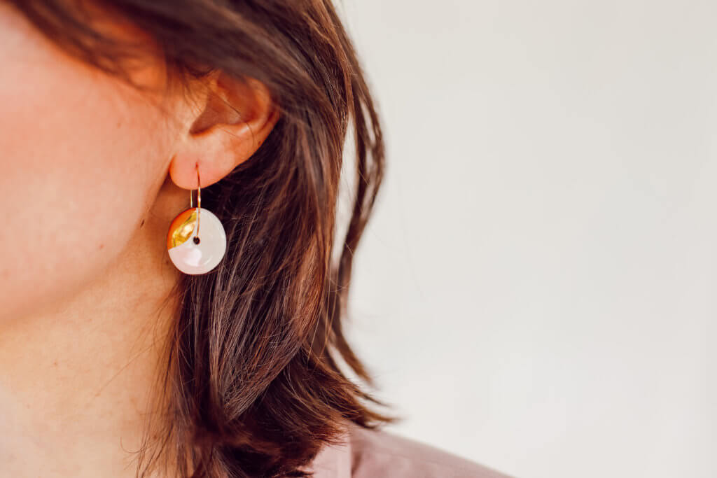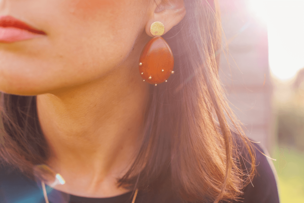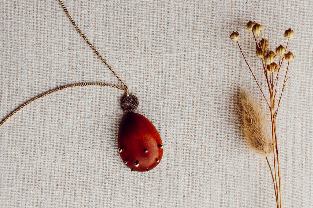 À l’approche de Pâques, le printemps est symbole de renouveau, d’éclosion de la nature, de fertilité… Les boucles et le collier Juliette, inspirés d’un œuf, moucheté comme celui d’une hirondelle, entrent dans cet état d’esprit. Ce sont deux pièces que j’affectionne particulièrement de par le travail réalisé, à la main, sur le bois de merisier, pour le tailler. La créatrice utilise du bois de merisier issu d’arbres tombés pendant la tempête de 1999 dans la région de Cognac.