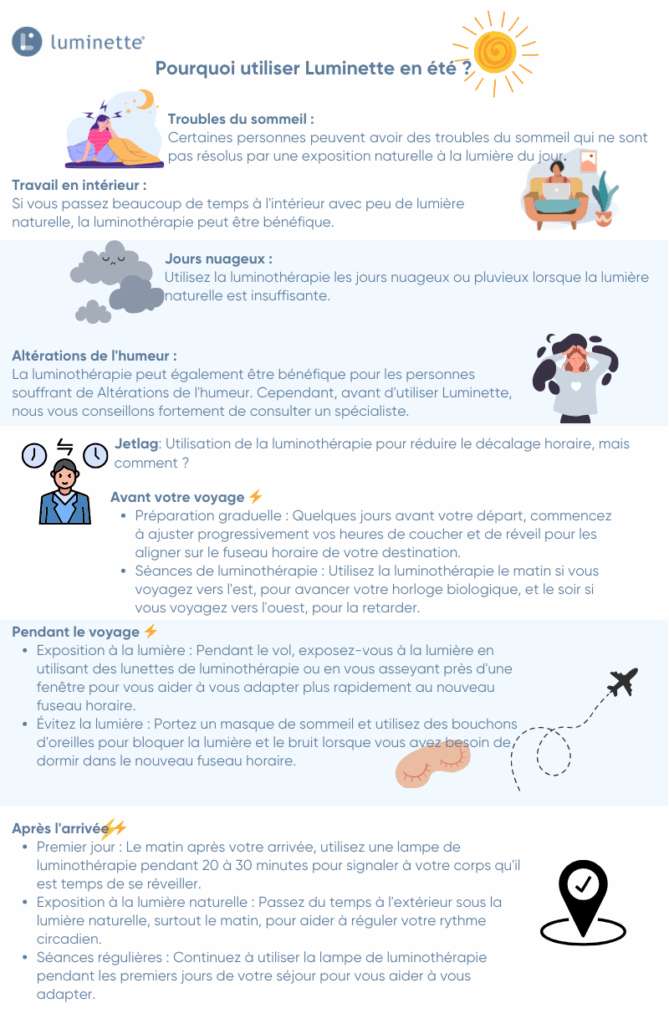 Il y a aussi plusieurs circonstances pour lesquelles la Luminette est intéressante à utiliser en été (voir image ci-après) :